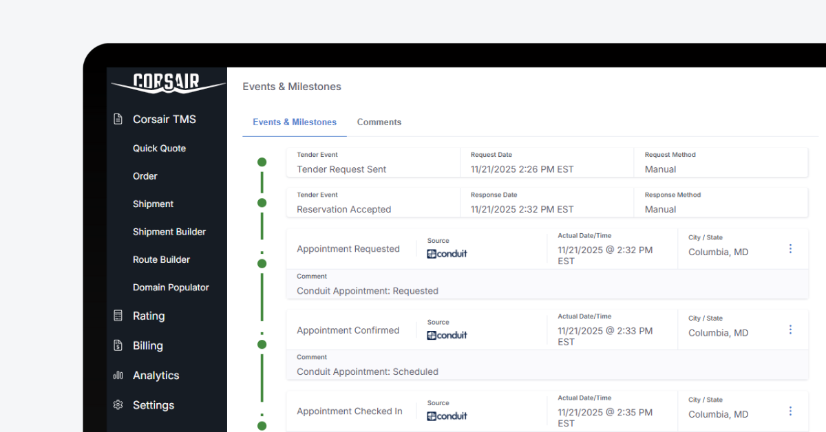 “Transportation execution breaks down when appointment scheduling lives in emails, phone calls, and disconnected tools,” said Conrad Lilleness, Founder & CEO of Conduit. “By integrating Conduit into Corsair, customers can manage dock scheduling and time-stamped appointment milestones directly within the shipment workflow, keeping transportation and warehouse teams aligned without manual coordination.”